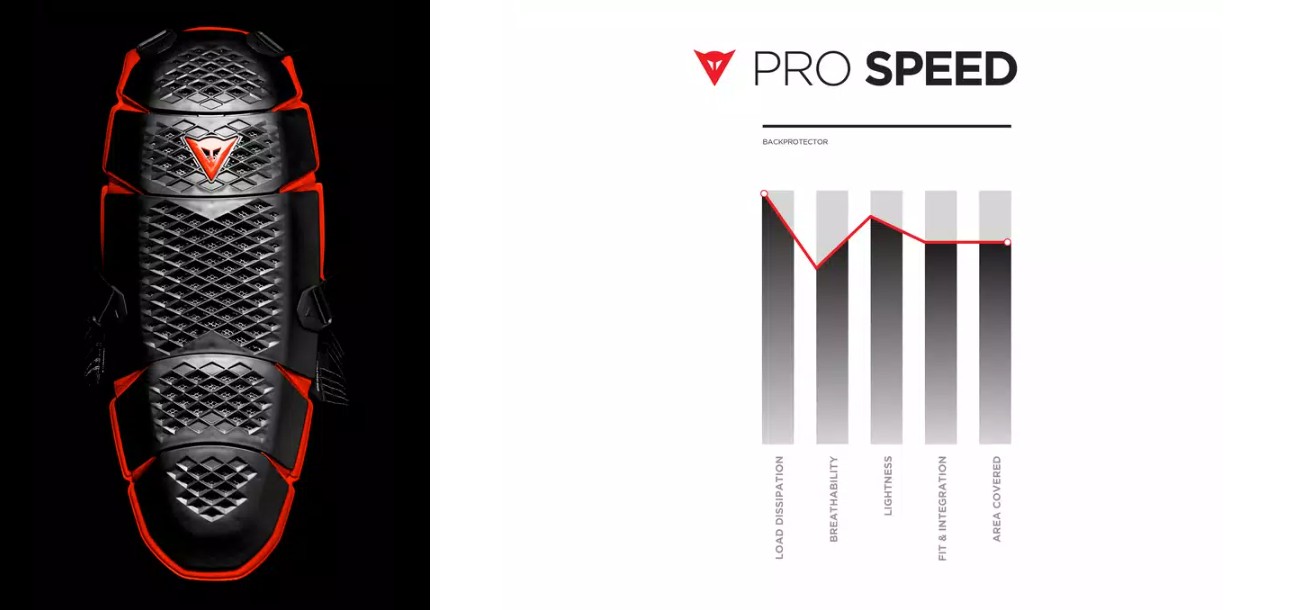 The utmost in two-wheeled safety. it guarantees the rider first-rate aerodynamic performance during sports riding or track sessions. This certified back protector is the latest Dainese creation in the category. Its pre-curved rigid structure makes for unbeatable ergonomics. while freedom of movement in the saddle is guaranteed by complete lateral and vertical/longitudinal torsion. It offers a riding experience that combines the highest safety standards with unique levels of lightness and ventilation. The perforated surface of the back protector ensures all the necessary ventilation. even on the hottest of routes. The key to a Pro-Speed protector is its exclusive aluminum internal structure. which offers maximum protection against impact in any situation and adapts to changes in temperature. The evolutions in design and technology make for a back protector that ensures an adrenaline-fueled ride through every turn.