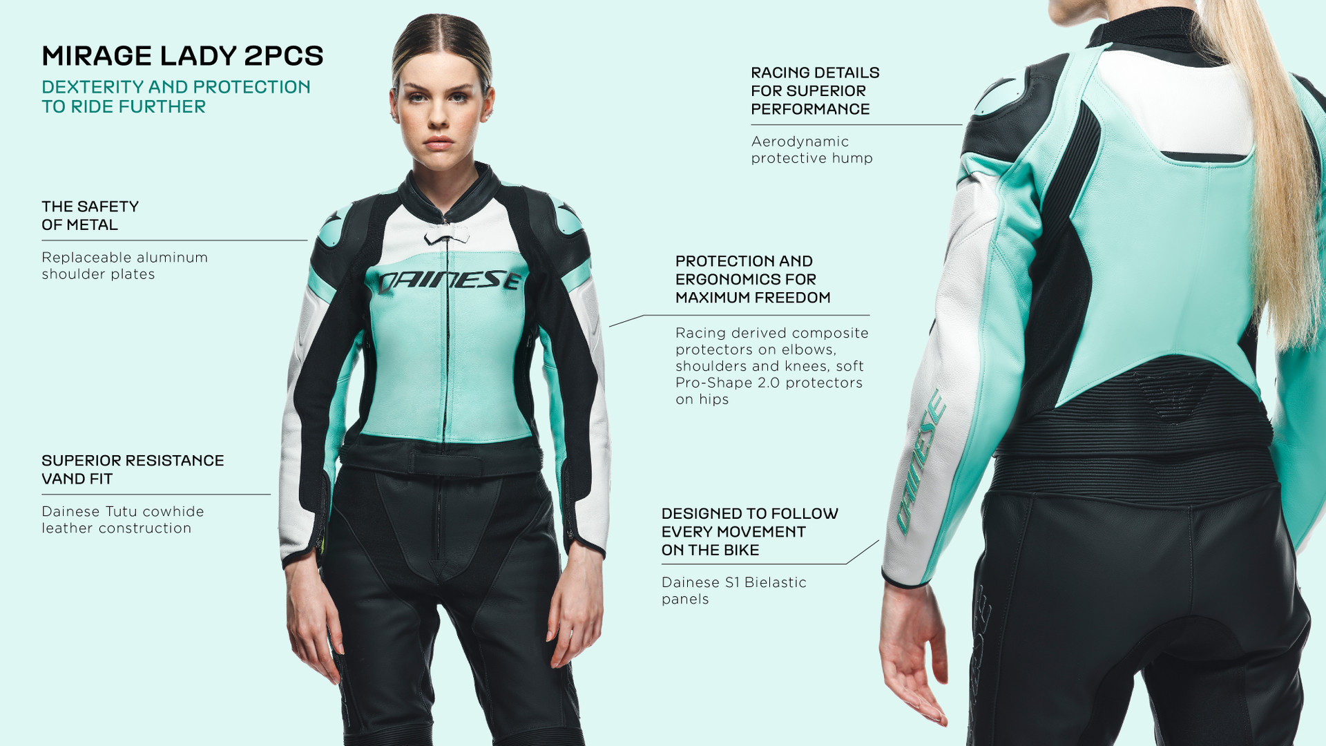 Women's Dainese Mirage two-piece motorcycle suit made with premium Tutu cowhide and ergonomically designed to best suit a woman’s body. Suitable for sport use. it is specifically optimized for road riding.